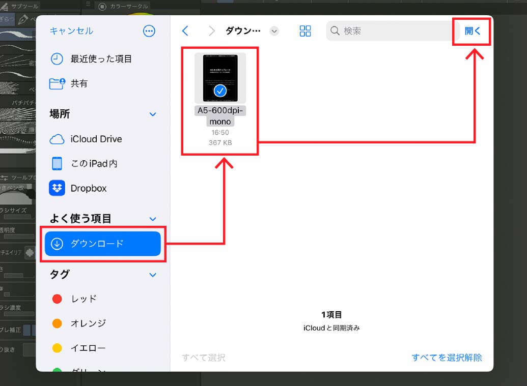 CLIP STUDIOアプリ>ファイル>開く を選択