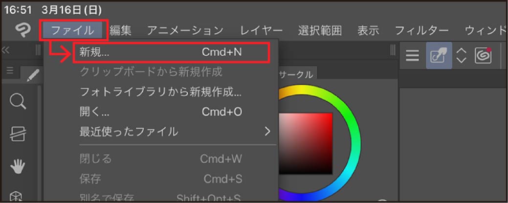 CLIP STUDIOアプリ>ファイル>新規 を選択