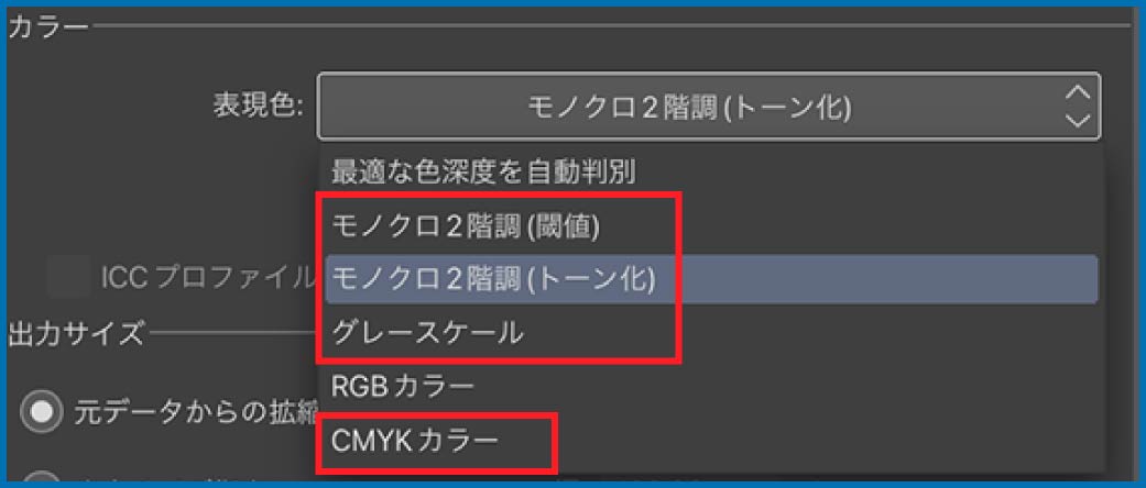 こちらで補正しますのでモノクロ原稿の場合もCMYKを選択してください。
