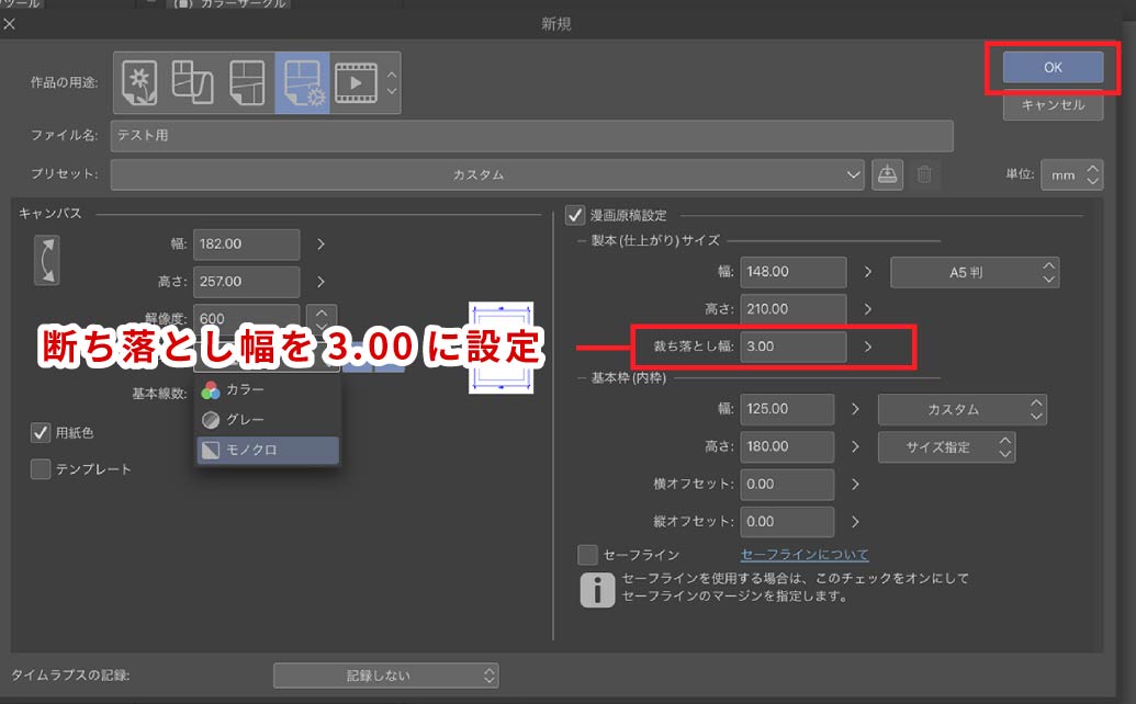 デフォルトの断ち落とし幅「5.00」を「3.00」に変更