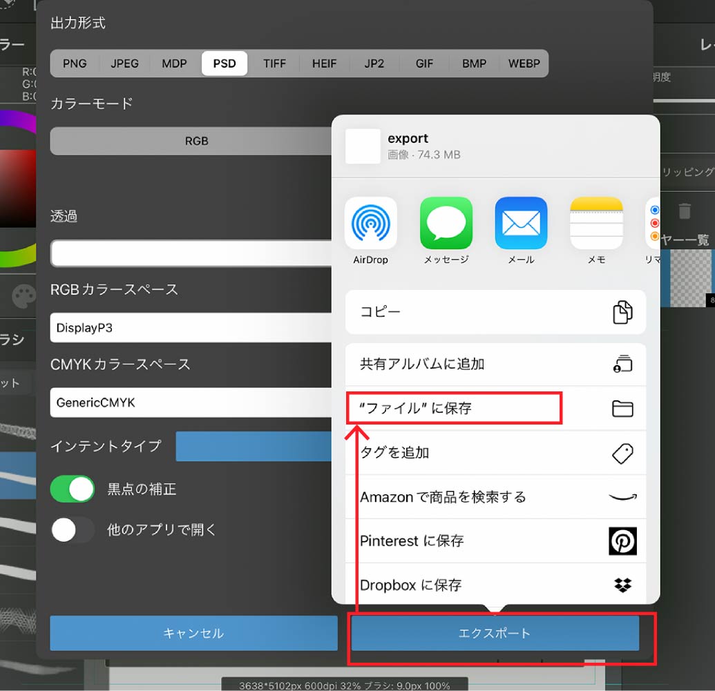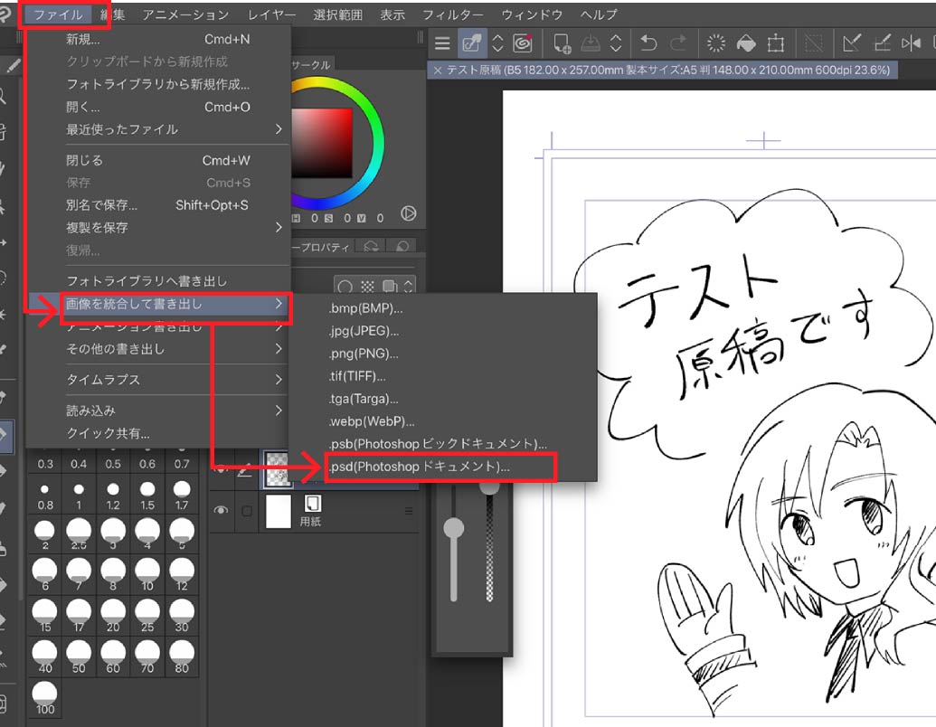 ファイル>画像を統合して書き出し>.psd(Photoshopドキュメント)を選択
