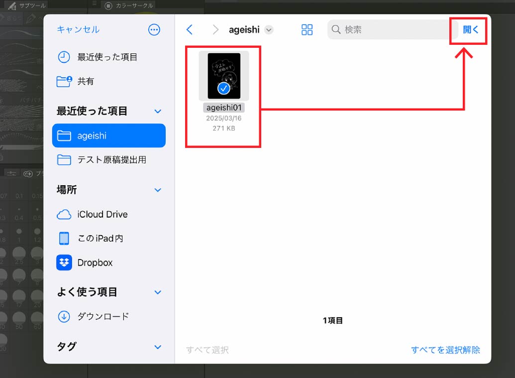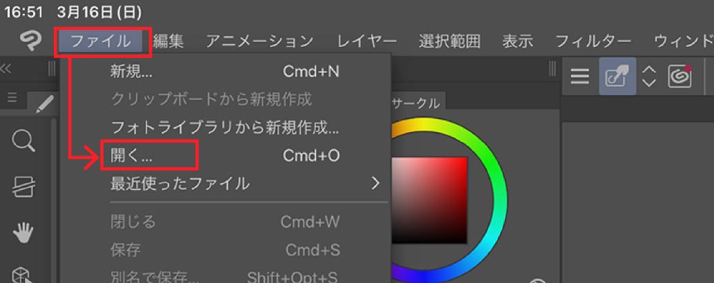 CLIP STUDIOアプリ>ファイル>開く を選択