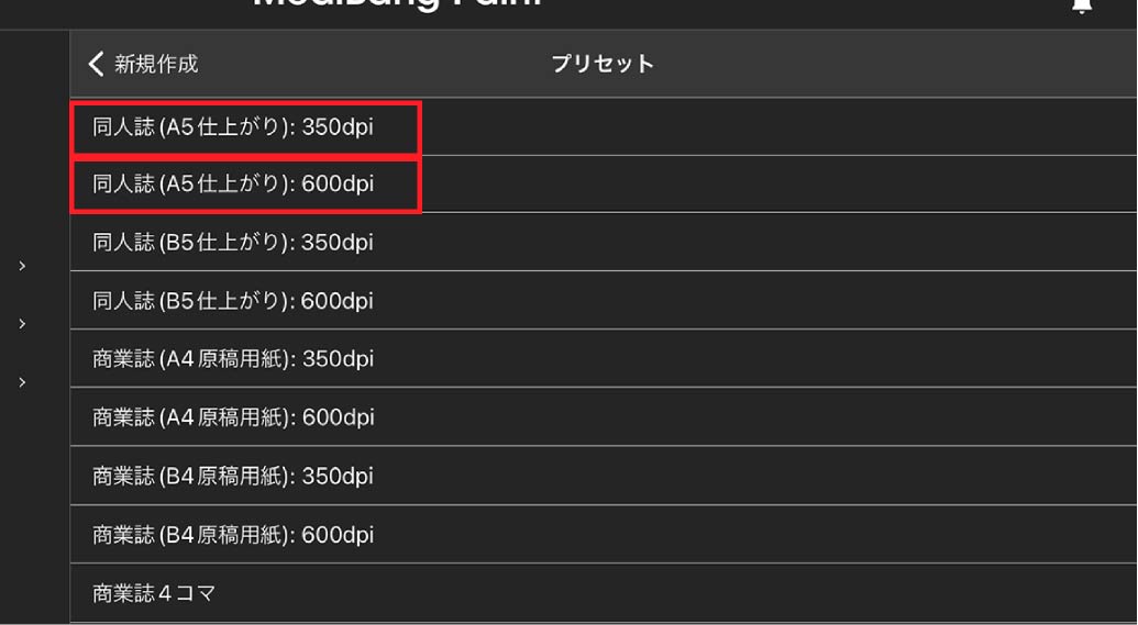 メディバンペイントアプリ>イラスト作成アイコン>新規作成 を選択