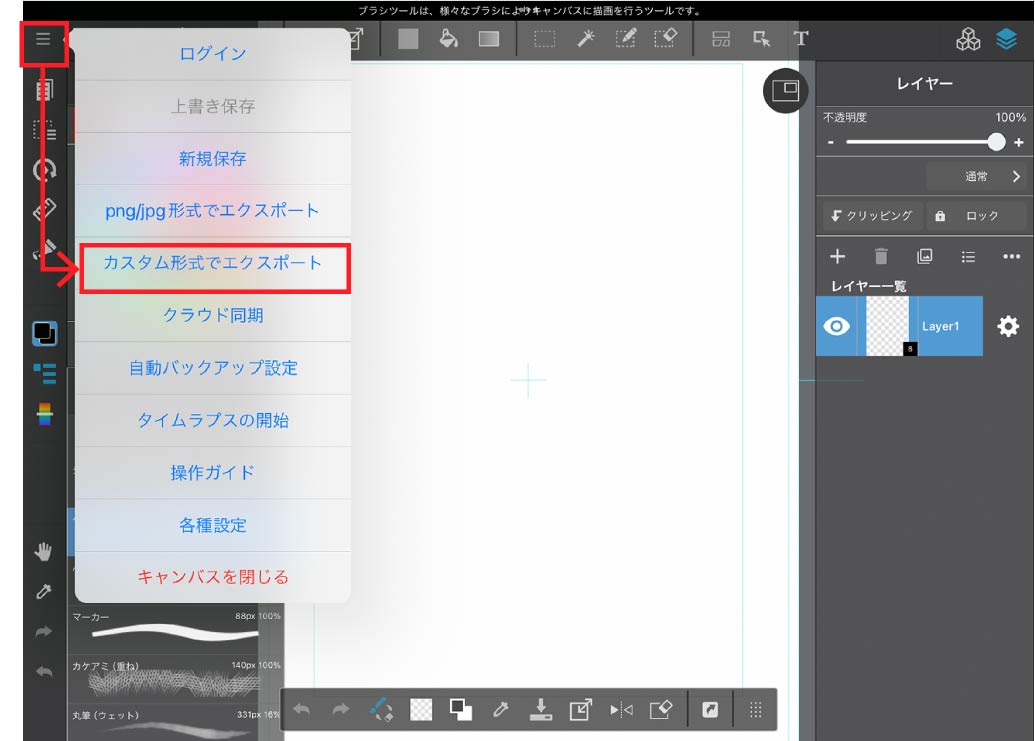メニューアイコン>カスタム形式でエクスポート を選択