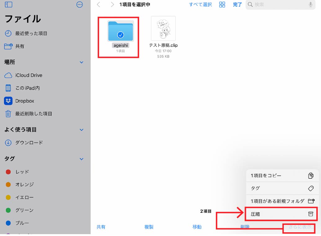 選択>さらに表示>圧縮をすると一つのZipファイルになります。
