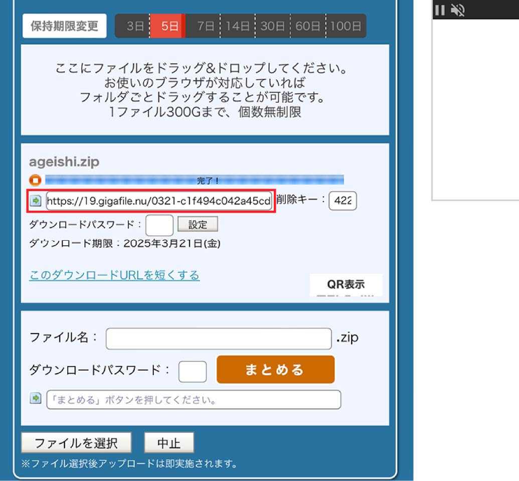 ファイルのアップロードが完了するとダウンロード用のURLが表示されますので、コピーしてください。
